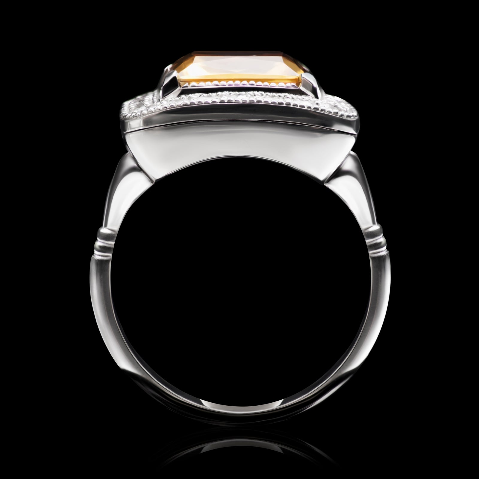 In this ring Nigel has taken this ancient principal of a reflector and made it as an opening platinum door built in to the ring which enables both the reflector door panel and the facets at the back of the citrine to be cleaned. This maintains the mirror like flash the reflector provides for all time, ensuring the citrine continues looking splendid and rich in colour.