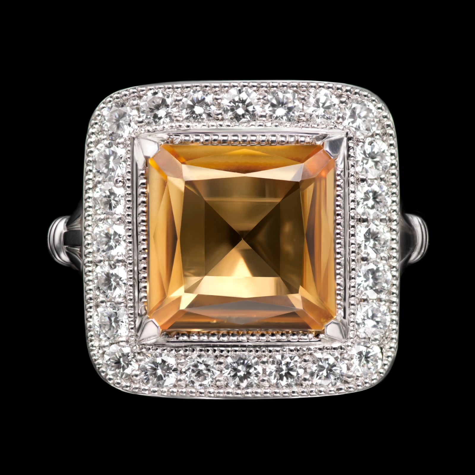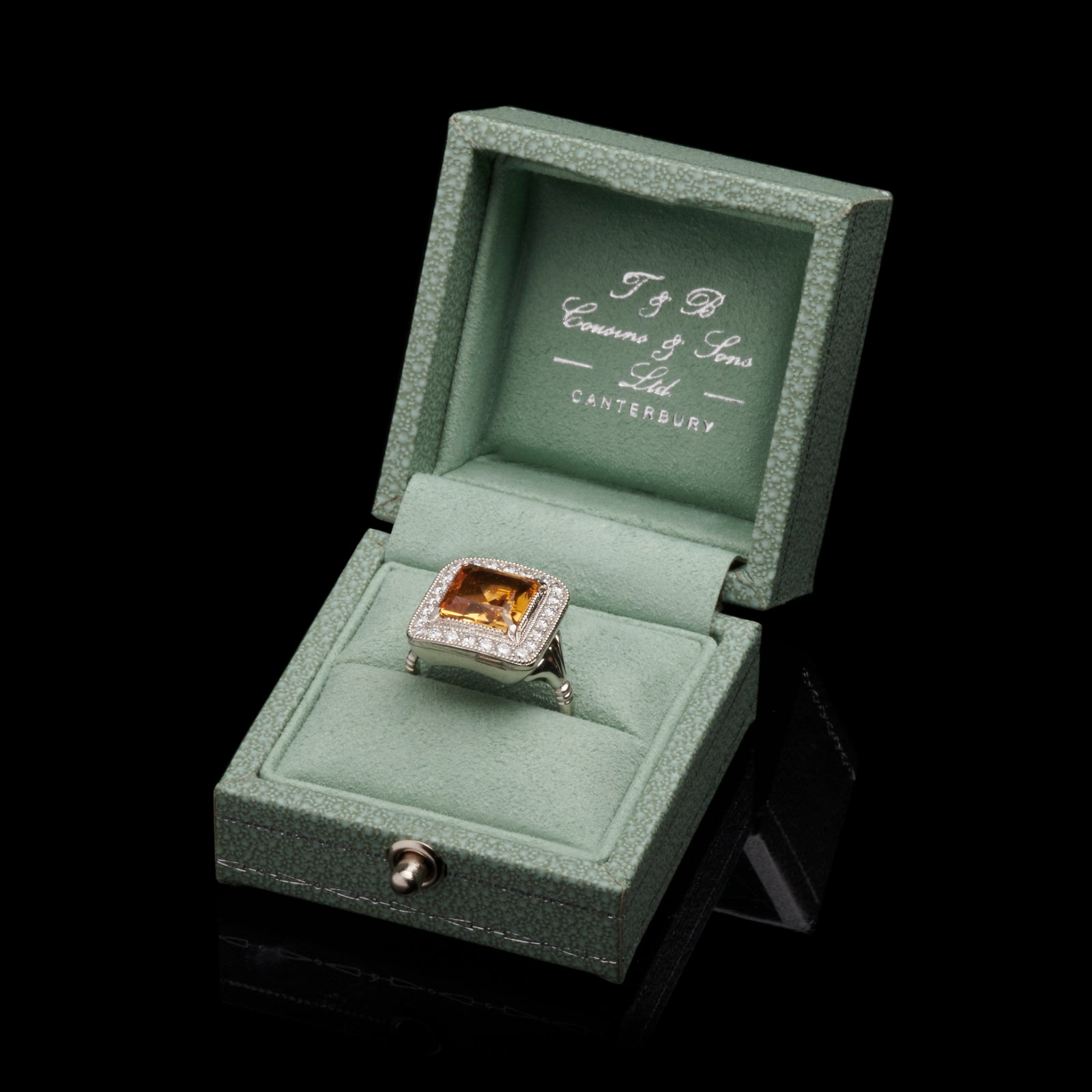 The citrine weighs 2.63 carats, with a diamond surround of 24 brilliants all E colour, VS clarity and the ring mount and shank is platinum. The curved inner shape of the underside of the reflector makes the ring very agreeable indeed upon the finger, not just practical and wonderfully comfortable, this ring captures the essence of an antique jewel and is a joy to behold.